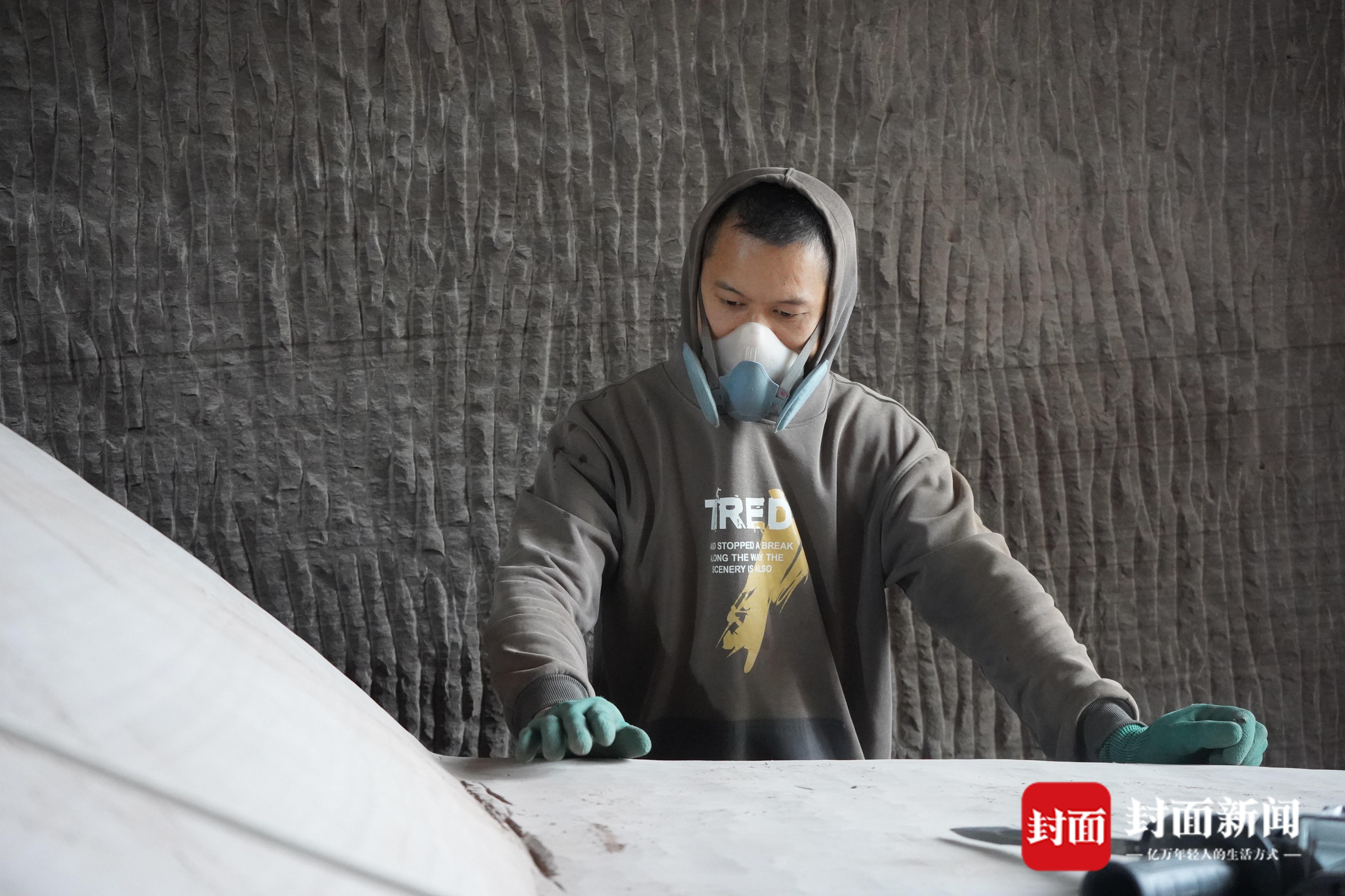 11月1日,四川资阳安岳县被淅淅沥沥的秋雨裹着,在山林间一处人工开凿的石窟中,带着防尘口罩的周明冬正握着角磨机打磨石质汽车的雏形,指缝里还嵌着未洗去的石屑,火星混着浅灰色石粉落在满是工具的地面上,抽风机嗡嗡作响,试图吹散洞窟里厚重的灰尘。